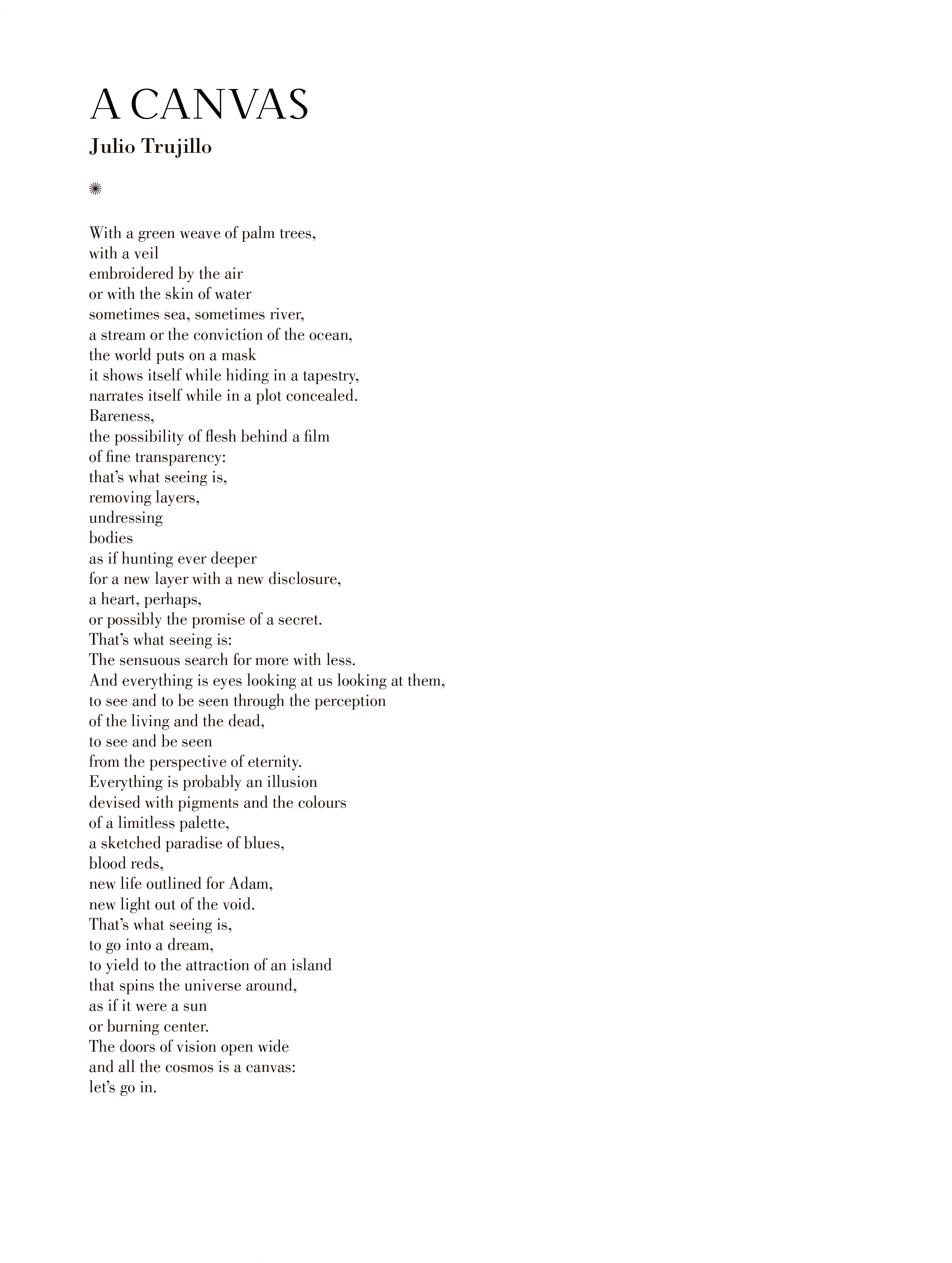 Boys lie in pools of water, ambiguously testing the distance between languid repose and deathly calm. Hybrid and non-binary figures are partially submerged and at the same time affirmatively exposed. Searching faces look out from behind veiled coverings, verdant foliage, TV screens, masks, headdresses, returning our gaze, waiting for answers. Five deer dancers have been caught in a heavy downpour or are bobbing far out to sea. Bodies reach out for other bodies. Two men think about a swim among the broken tombstones, unearthed and rearranged by a hurricane. And a boy in a guayabera stands before the scorched red of his imagination with an owl and together they scrutinise us.