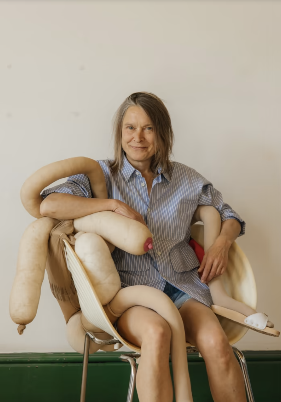 She has remained endearingly constant in her irreverence in the decades after, never losing her partialness to a bit of smut. “I probably haven’t changed much,” she confirms, sitting in her studio. “I’m not sure if that’s a good or a bad thing.” Grey hair loose, large eyes beaming, Lucas is wearing a blue striped shirt with red bra poking out, trainers with neon-green socks and some extravagantly customised, patchworked jeans, which once belonged to her partner, the photographer Julian Simmons (“until he got fat”). Her workspace is a former village hall she took over a few years ago; until then, she worked solely at home, a few miles away, in the cottage formerly owned by Benjamin Britten that she shares with Simmons.
